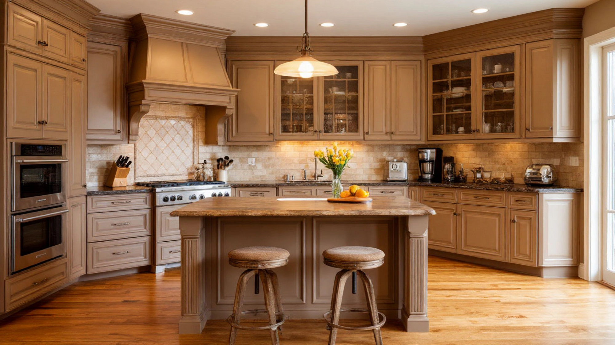 Особое внимание уделено сочетанию цветов и материалов. Теплый капучино в фасадах гармонирует со столешницами из светлого или благородного камня, создавая визуальный контраст и подчеркивая изысканность интерьера. Металлические элементы, такие как вытяжка, плита, встроенная техника и мойка, добавляют современности и технологичности, не нарушая классического духа кухни. Такое сочетание материалов делает интерьер одновременно утонченным и практичным, обеспечивая долгие годы эксплуатации без потери эстетической привлекательности.